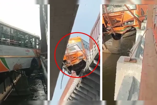 “बाल-बाल बचे 16 यात्री: सड़क पर पत्थर से फिसली यूपी रोडवेज बस, ब्रिज पर लटकी”